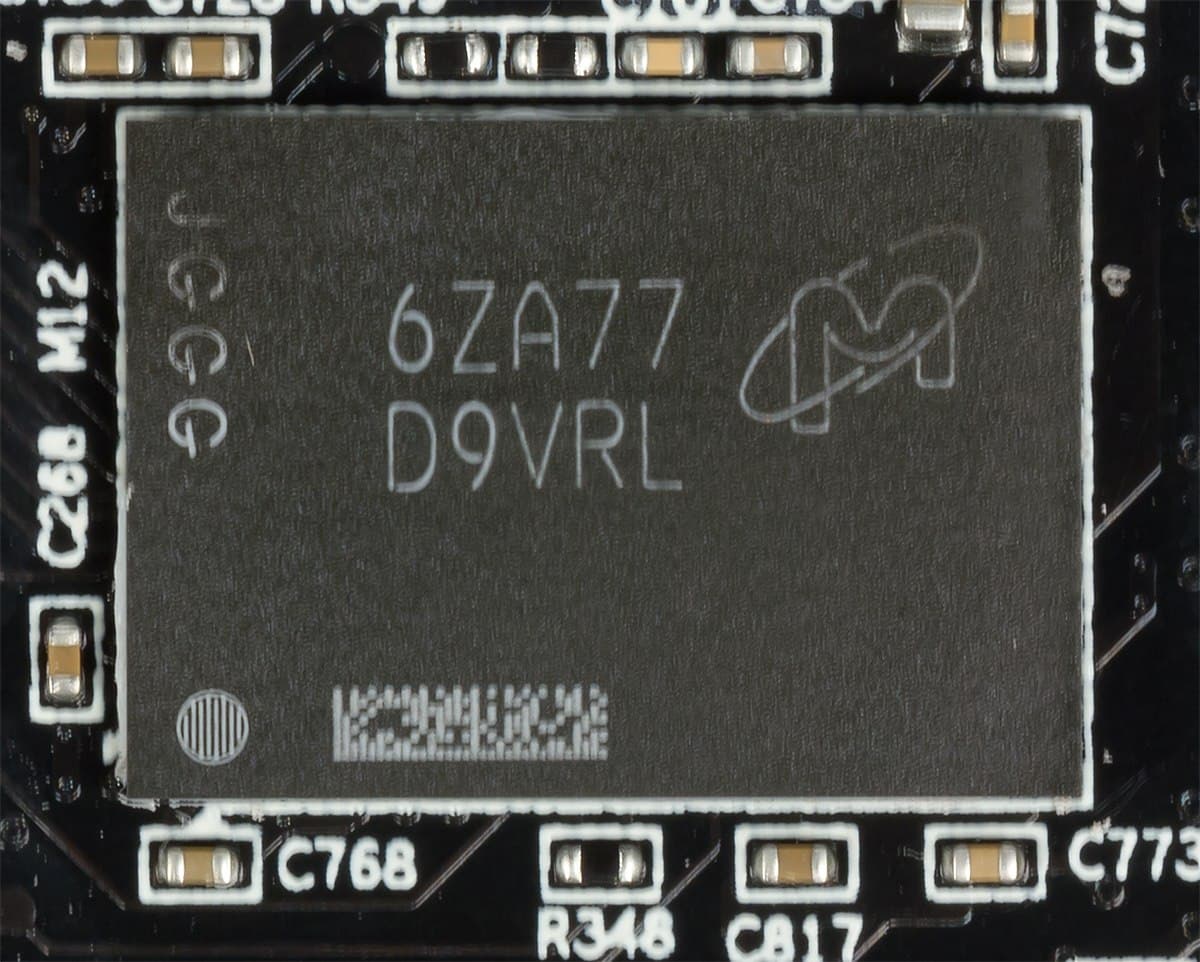 Карта имеет 11 ГБ памяти GDDR5X SDRAM, размещенной в 11 микросхемах по 8 Гбит на лицевой стороне PCB. Микросхемы памяти Micron (GDDR5X) рассчитаны на номинальную частоту работы в 2800 (11200) МГц. | ![]() |