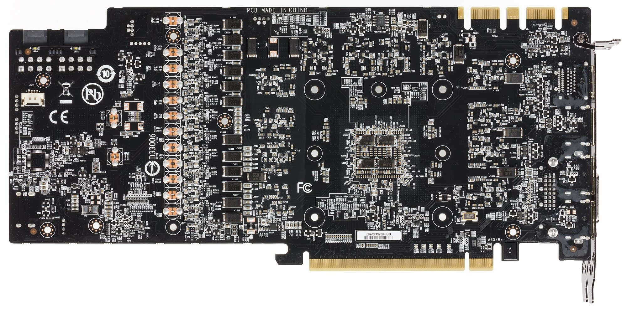 Система питания получила 12 фаз для GPU и 2 фазы для памяти, что дает возможность регулировать вольтажи с очень малым шагом для достижения максимального разгона с сохранением стабильной работоспособности и защитой элементов от перегорания. Преобразователь питания управляется цифровым контроллером uP9511P производства uPI Semiconductor. Ускоритель поддерживает функцию мониторинга, за которую отвечает контроллер Holtek HT32F52241 на базе микроконтроллера ARM Cortex -M0+. Стоит упомянуть и технологию производства PCB — Ultra Durable, которая подразумевает двойные медные слои и набор высококачественных дросселей и твердотельных конденсаторов. Все это снижает нагрев карты, а также производитель дает гарантию отсутствия свиста катушек при работе ускорителя.
