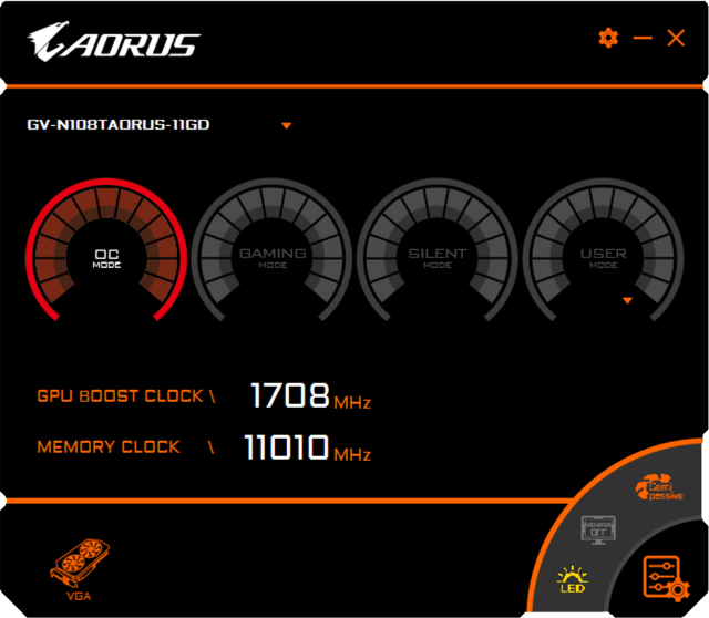 У данного ускорителя Aorus на 5,5% повышены частоты работы относительно стандартных параметров референс-карты, что может обеспечить прирост производительности примерно в 5% в зависимости от разрешения и режима работы.