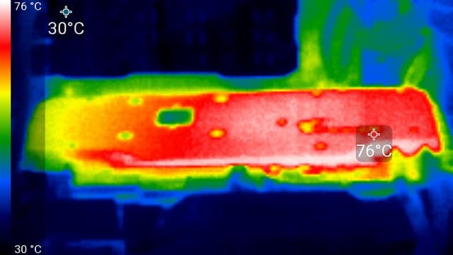 Максимальный нагрев 79 °С — на печатной плате в районе выреза в пластине с обратной стороны. На фотографии зафиксировано меньшее значение, так как снято с большего расстояния.