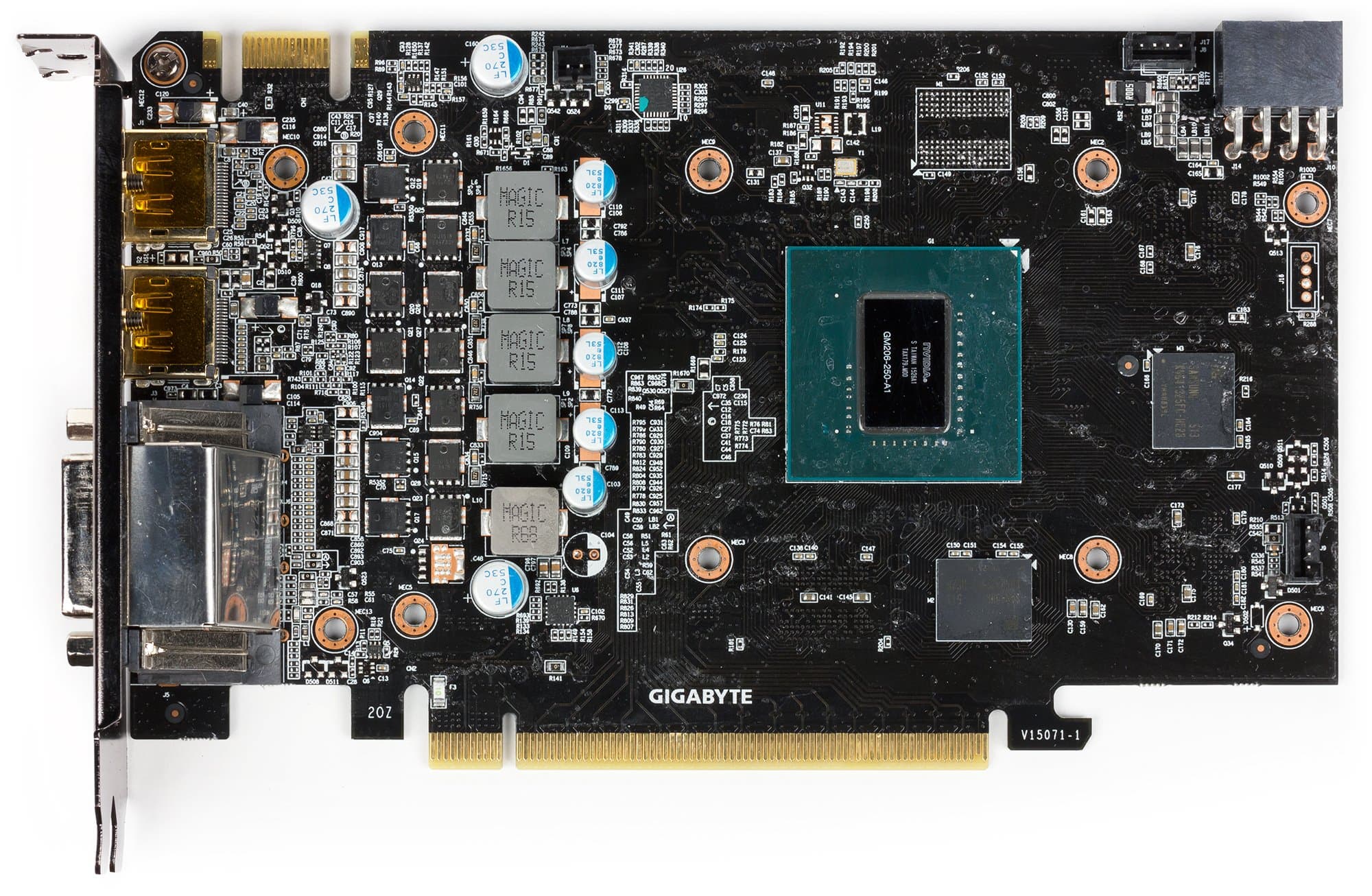 Печатная плата создана силами инженеров Gigabyte, она отличается от референс-аналога системой питания, которая в данном случае работает по схеме 4+1 фаза, поддерживает технологию Ultra Durable VGA, что вкупе с использованием особых элементов силового блока уменьшает энергопотребление и нагрев PCB.