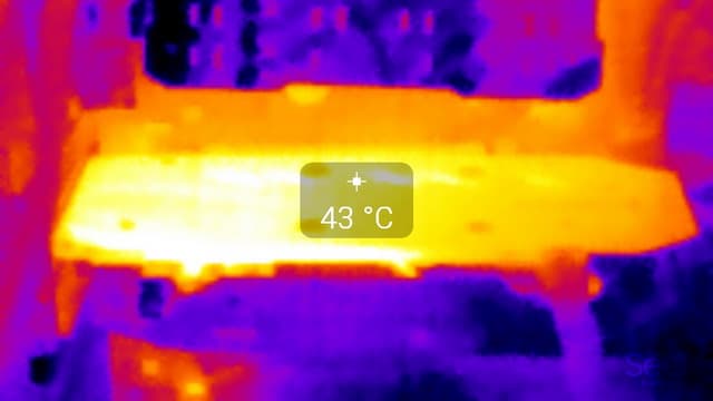 На тыльной стороне платы расположена пластина, мешающая локализовать максимально нагретую область, но она находится примерно в зоне преобразователей напряжения.