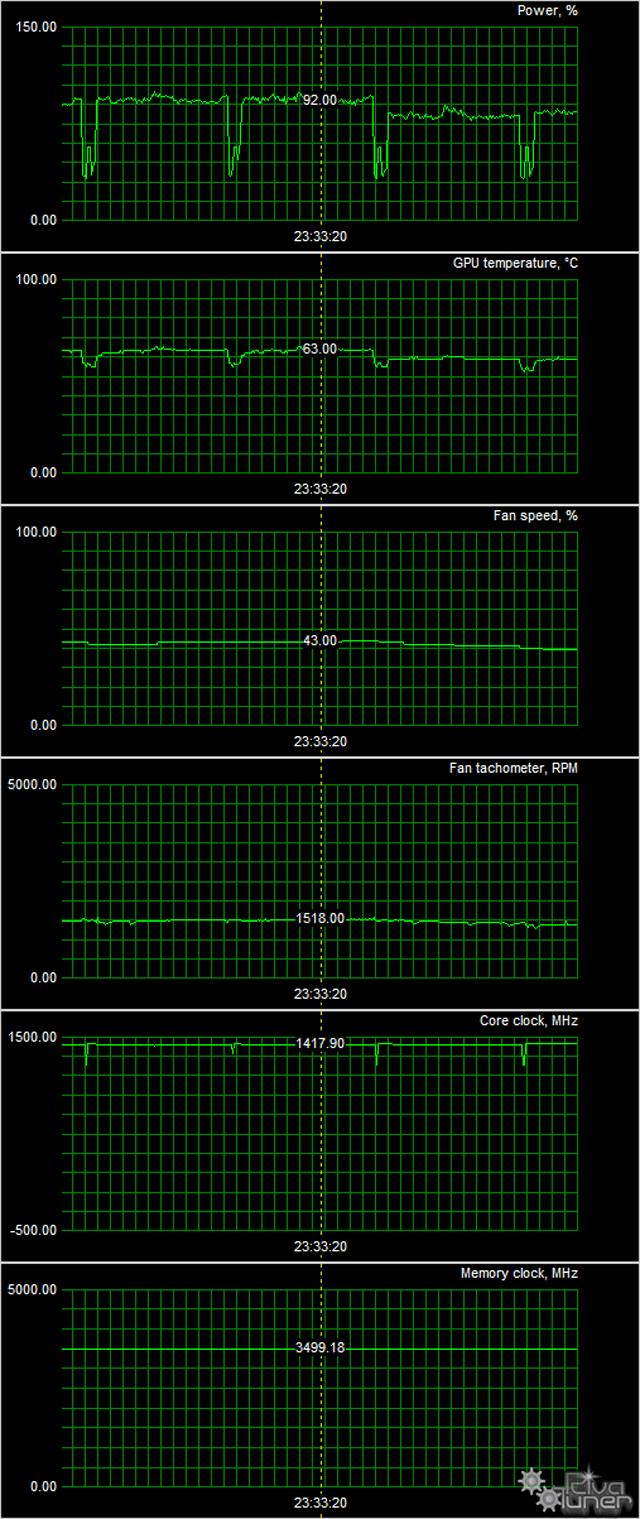 В режиме максимальной нагрузки в 3D температура достигала 60 °C, затем рост замедлялся. Максимум получился 63 °C, вентиляторы при этом раскручивались до 1518 оборотов в минуту, шум вырастал до 35,5 дБА. В итоге тихой данную СО назвать нельзя, но и слишком уж шумной она не является. Напрашивается оптимизация работы кулера со стороны производителя, так как максимальная температура GPU под нагрузкой остается достаточной низкой, и можно было бы пожертвовать некоторой долей эффективности СО, чтобы снизить уровень шума. В 2D-режиме карта почти бесшумная.