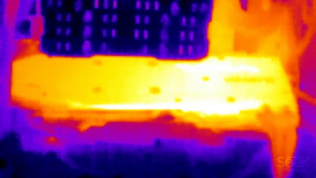 На тыльной стороне платы установлена пластина, мешающая четко локализовать максимально нагретую область, но она расположена примерно в зоне преобразователей напряжения.