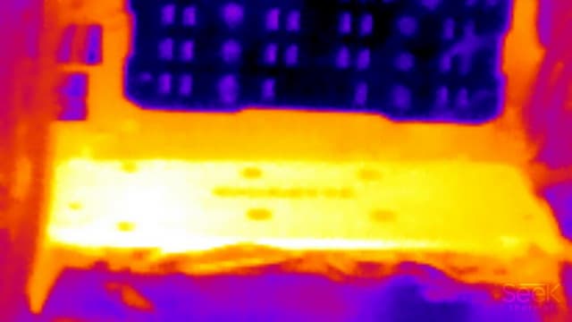 Наибольший нагрев — в зоне GPU и преобразователей напряжения.