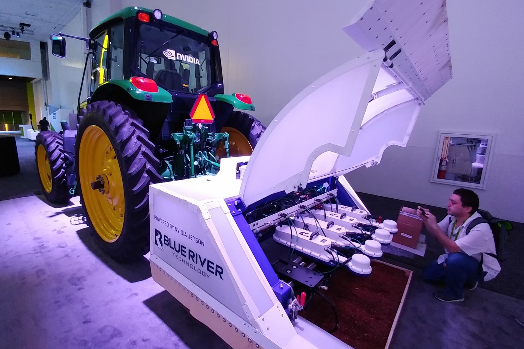 Особенно много на выставке было роботов, включая робота-кладовщика, робота для подводного плавания, робота для ухаживания за людьми, робота для поддержки правопорядка и т. д. Одним из самых интересных нам показался даже не робот, а прицепное устройство к трактору для применения в сельском хозяйстве от компании Blue River — с технологией «See & Spray».