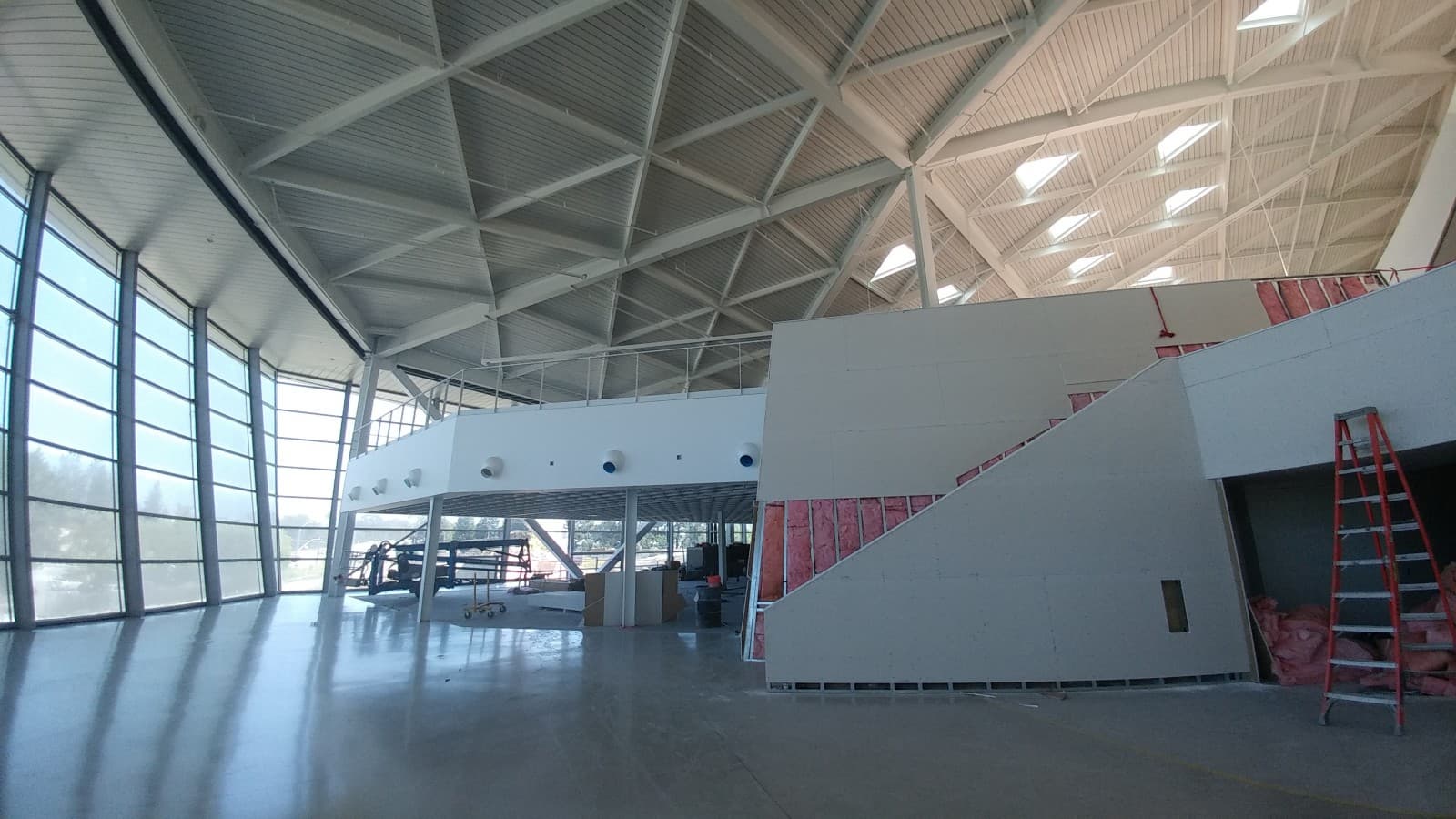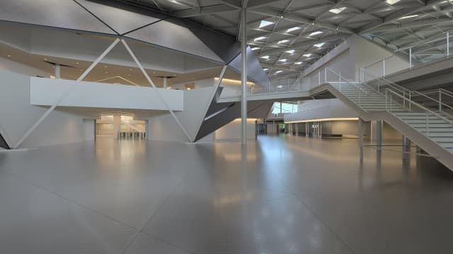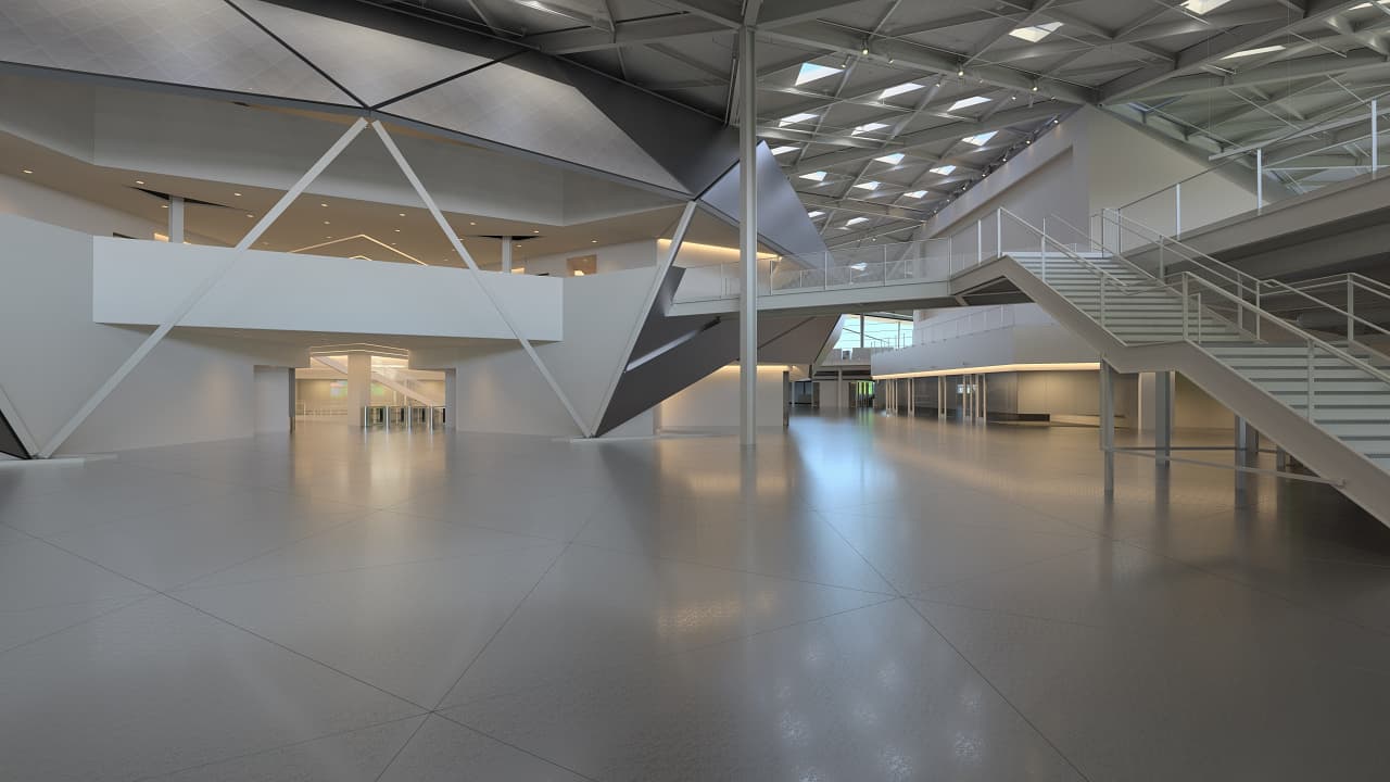 Форма у объекта симметричная, за исключением некоторых деталей, а уникальная волнообразная крыша здания выполнена из различных модулей в виде 245 равносторонних треугольников со стороной в 9 футов (2,74 метра). Над центральной частью (атриум) расположено большое окно для естественного освещения. Окон тут в принципе очень много — по сути, большая часть крыши, а всего здание имеет 6689 квадратных метров остекления.