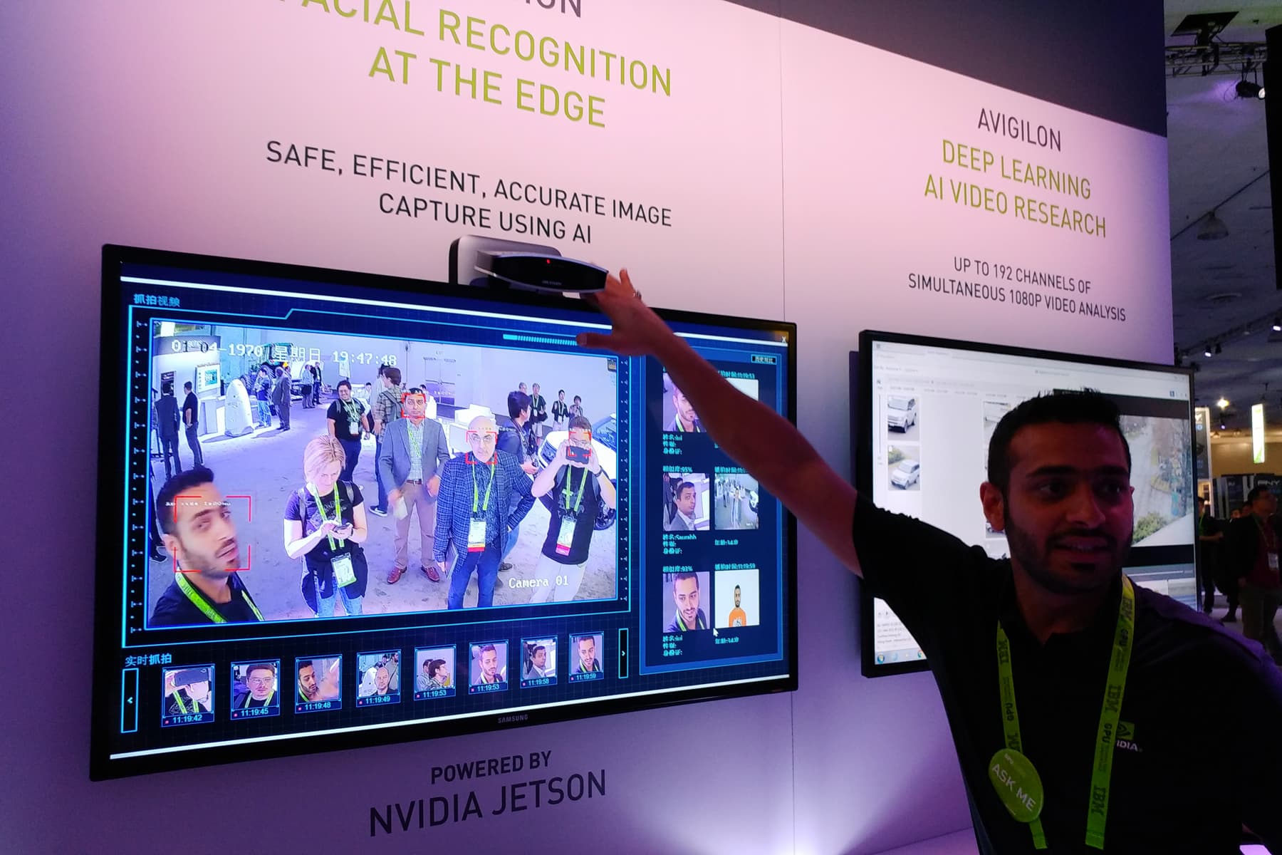 В выставочной части конференции GTC было представлено несколько рабочих вариантов подобных систем, которые не просто распознают объекты и лица с высокой точностью, но и запоминают их и каталогизируют. К примеру, «запомнив» одного из отмеченных на видео людей, система от Aviglion способна распознать этого человека в следующий раз, несмотря на то, что его лицо будет при других условиях освещения и иначе ориентировано по отношению к камере. При этом, все необходимое для инференса встроено прямо в камеру — конечно же, это встраиваемая вычислительная система Jetson.