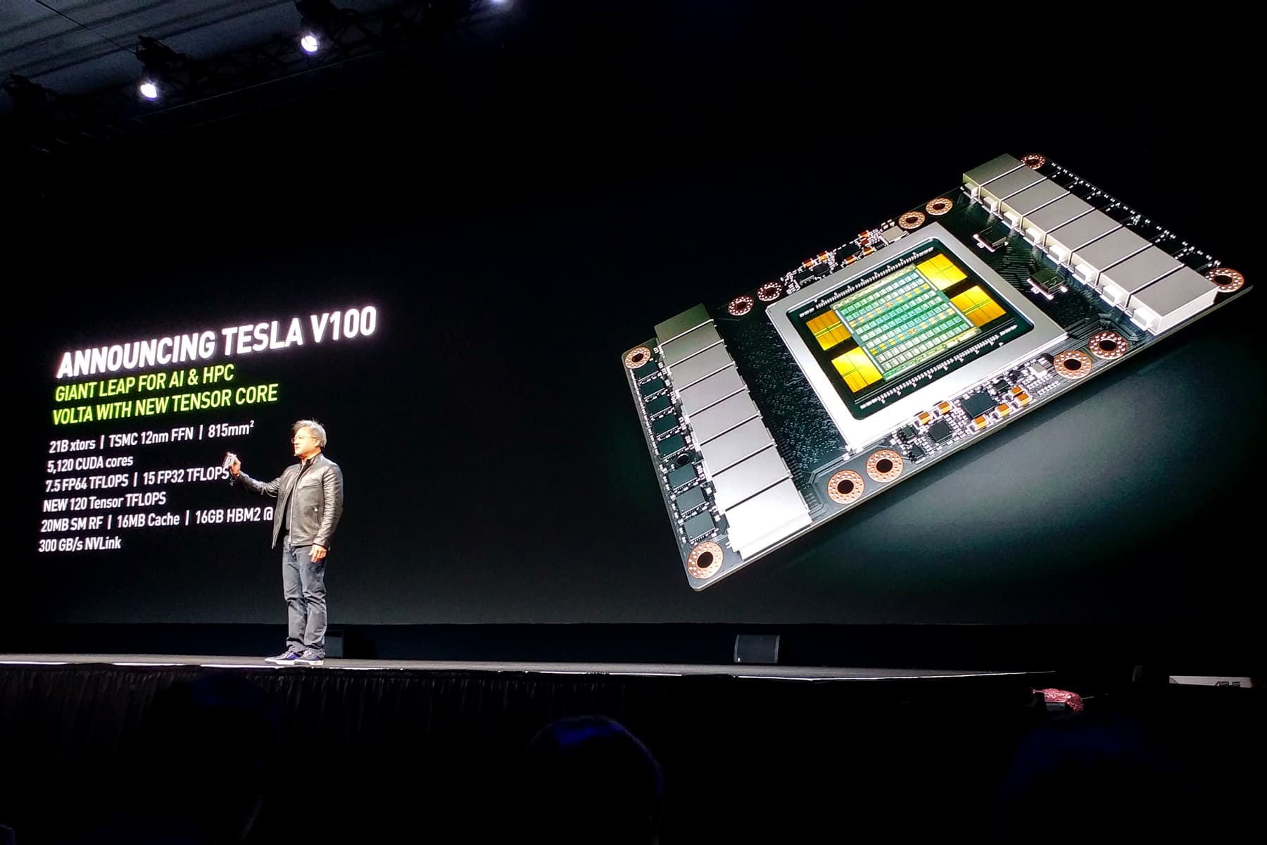 Для понимания сложности задачи, Дженсен привел такие данные: в процессе разработки архитектуры Volta и первого вычислительного процессора на его основе, получившего название Tesla V100, было потрачено три миллиарда долларов. Новый GPU включает более чем 21 млрд. транзисторов, объединяя ранее известные нам ядра CUDA и новые специализированные ядра Tensor core, обеспечивающие производительность в задачах обучения и инференса нейронных сетей, идентичную сотне CPU!