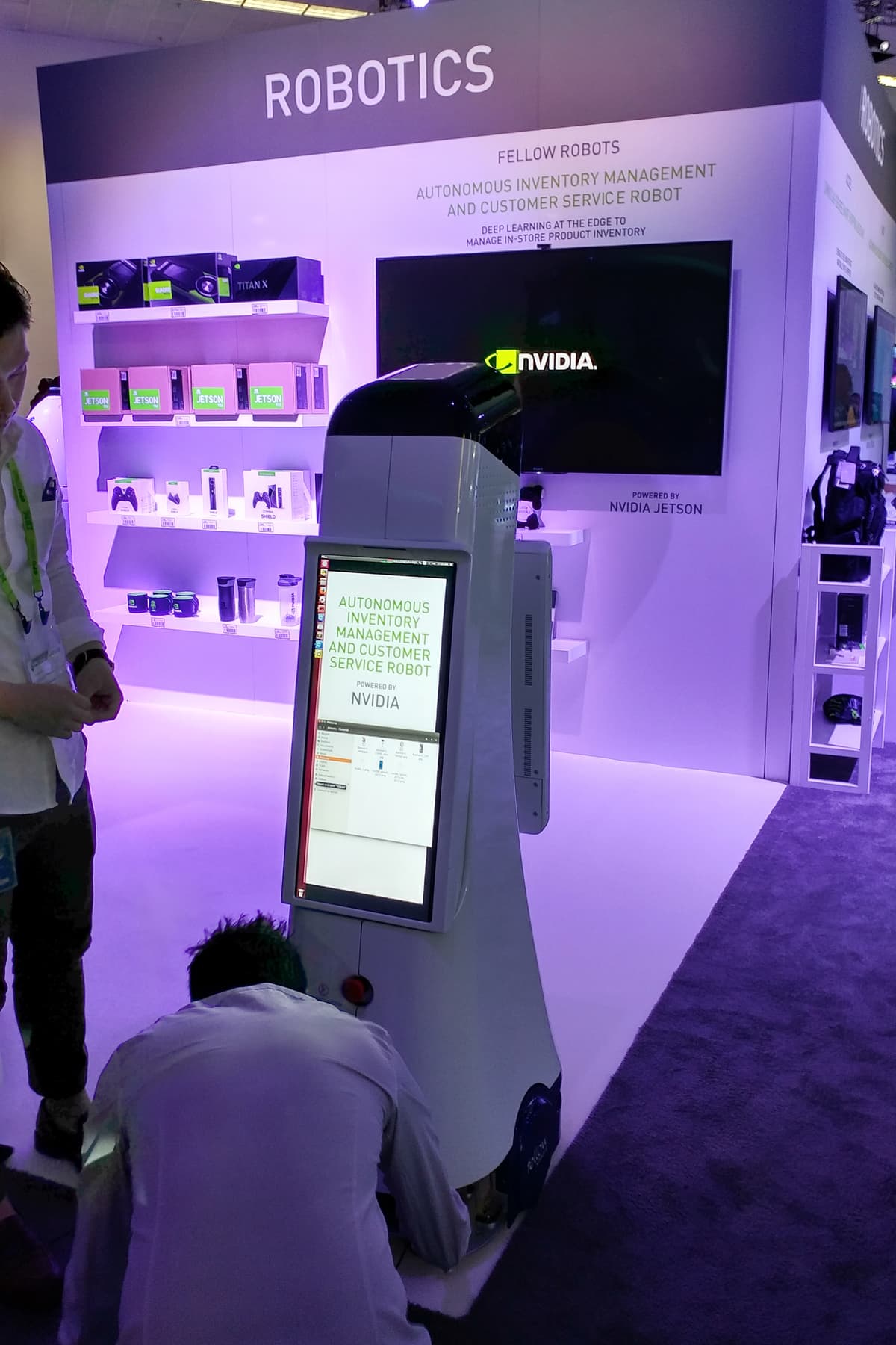 Или помощники на складе — на стенде Nvidia был показан рабочий образец такого «кладовщика», который также использует все ту же мегапопулярную систему Nvidia Jetson для того, чтобы с использованием возможностей ИИ общаться с покупателями или посетителями сервис-центра, находя и выдавая им необходимый товар со склада.