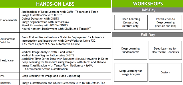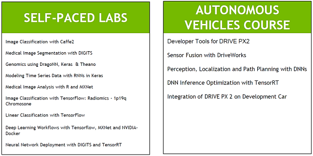 Nvidia добавила в перечень курсов DLI сессии по практическому применению алгоритмов глубокого обучения в самоуправляемых автомобилях, здравоохранении, робототехнике, видеоанализе и финансах. Также компания сотрудничает с Udacity, чтобы провести в рамках Института курсы для разработчиков приложений для самоуправляемых автомобилей. Чтобы удовлетворить растущий спрос со стороны компаний и университетов, Nvidia значительно расширила свои предложения на этот год. На GTC были представлены новые темы, освещаемые в рамках DLI в 2017 году: