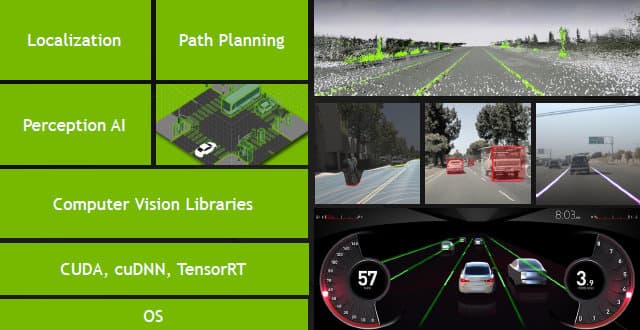 Решения Nvidia для автомобилей отличаются своей полнотой, они включают в себя и отличные аппаратные возможности, и полный программный стек, начиная от операционной системы, продолжая библиотеками: CUDA, cuDNN, TensorRT, компьютерное зрение и заканчивая готовыми решениями по построению маршрутов, распознаванию объектов и т. д. DRIVE PX умеет сканировать дорогу, отслеживать динамические и статические объекты (автомобили, знаки и другие), запоминать маршрут и помогать в пилотировании. Также поддерживается функция Guardian Angel (Ангел-Хранитель), которая будет помогать экстренно оттормаживаться в случае внезапной опасности — к примеру, большого черного джипа, завершающего проезд перекрестка на «темно-оранжевый».