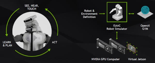Одним из множества возможных применений для систем искусственного интеллекта является имитатор для тренировки роботов от Nvidia по имени Isaac (Айзек), который был представлен главой компании в его ключевом выступлении. В имитаторе применяются сложные технологии компании для того, чтобы эффективно обучать умные машины в виртуальной среде, имитирующей условия реального мира еще до того, как робота с ИИ отпустят в «свободное плавание» по реальности.