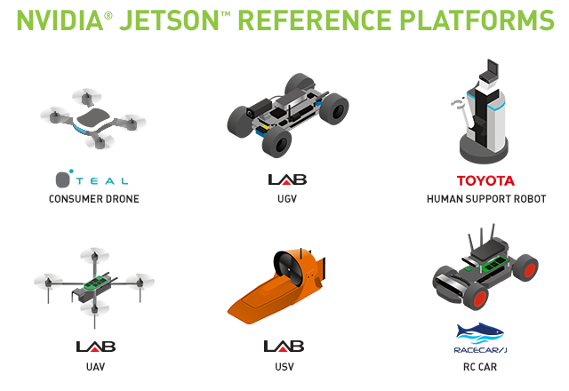 На своей конференции компания Nvidia также представила набор референсных платформ на базе решения Jetson, позволяющих ускорить процесс создания умных машин — Jetson Reference Platforms. В список референсных роботов входят разные их типы: дроны, автопилотируемые мини-автомобили, робот с манипулятором, катер и другие платформы. Основная идея таких платформ состоит в модуле с фиксированным стандартным API, который нужен для того, чтобы программисты ПО для роботов могли просто взять готовую программно-аппаратную платформу и сразу заниматься своим делом.