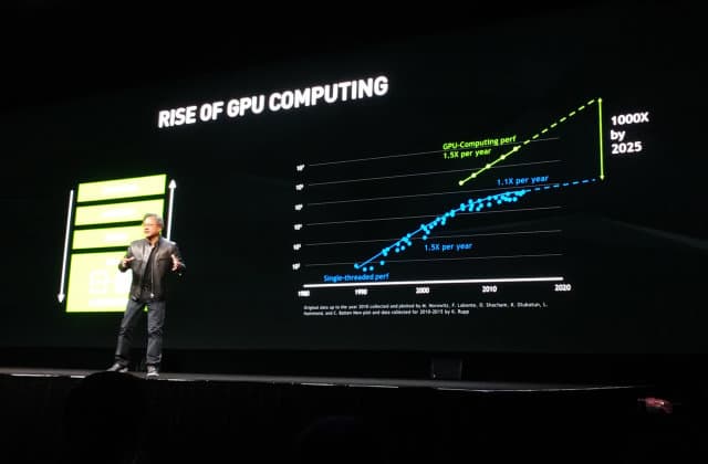 Nvidia как бы подстраивает закон Мура под себя, оценивая рост производительности систем, включающих вычисления на GPU. Если процессоры общего назначения ранее обеспечивали требуемый 1,5-кратный рост производительности, то в последние годы он снизился до +10% в год (речь об однопоточной производительности, конечно же), что не может удовлетворить индустрию. Но если учитывать прирост в скорости, даваемый графическими процессорами, то в целом полуторакратное ускорение в год вполне достижимо на практике и сейчас. А к 2025 году ожидается и тысячекратный прирост, а ведь это время настанет всего лишь через несколько лет.