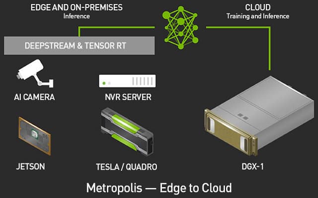 В состав платформы Metropolis входят различные решения компании Nvidia, работающие на единой вычислительной архитектуре. В камерах и видеорегистраторах быстро работает inference при помощи вычислительной платформы для встраиваемых систем Nvidia Jetson, в серверах и дата-центрах для анализа данных установлены ускорители Nvidia Tesla, а визуализация данных осуществляется при помощи профессиональных графических решений Nvidia Quadro. В состав платформы входят также пакеты инструментов для разработчиков: JetPack, DeepStream и TensorRT.