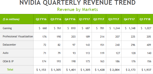 Но самое интересное в таблице совсем в других строчках. Если доходы от поставок профессиональных графических решений за пару лет практически не изменились, то в сфере автомобильных решений есть хоть и не огромный, но все же очень приличный двукратный рост за два года. Но самое важное кроется в строке Datacenter, которая и обозначает получающие все большее распространения решения для высокопроизводительных вычислений: серверов, дата-центров и т. д. Именно в этой сфере продажи выросли за два с небольшим года более чем в пять раз! Неудивительно, что Nvidia прикладывает большое количество сил для того, чтобы тренд продолжался. А пройдет несколько лет, и игровые решения компании и вовсе уступят первенство серьезным вычислительным задачам. Хотя ПК-игрокам в любом случае большой почет за то, что они оплачивают технический прогресс.