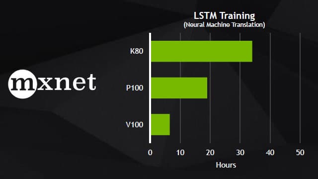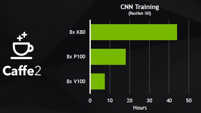 Пока что мы говорили лишь об аппаратной части, а ведь для современных вычислителей программная часть чуть ли не еще важнее. Оптимизированное для Volta программное обеспечение включает новую версию CUDA и ведущие фреймворки и приложения для ускорения ИИ. Программная поддержка Volta будет внедрена в следующие версии фреймворков глубокого обучения: Caffe 2, Microsoft Cognitive Toolkit, MXNet и TensorFlow, что даст возможность быстрого получения высокой производительности, которую может обеспечить Volta. Вот лишь несколько примеров сравнения V100 с P100 в некоторых задачах, использующих эти фреймворки: