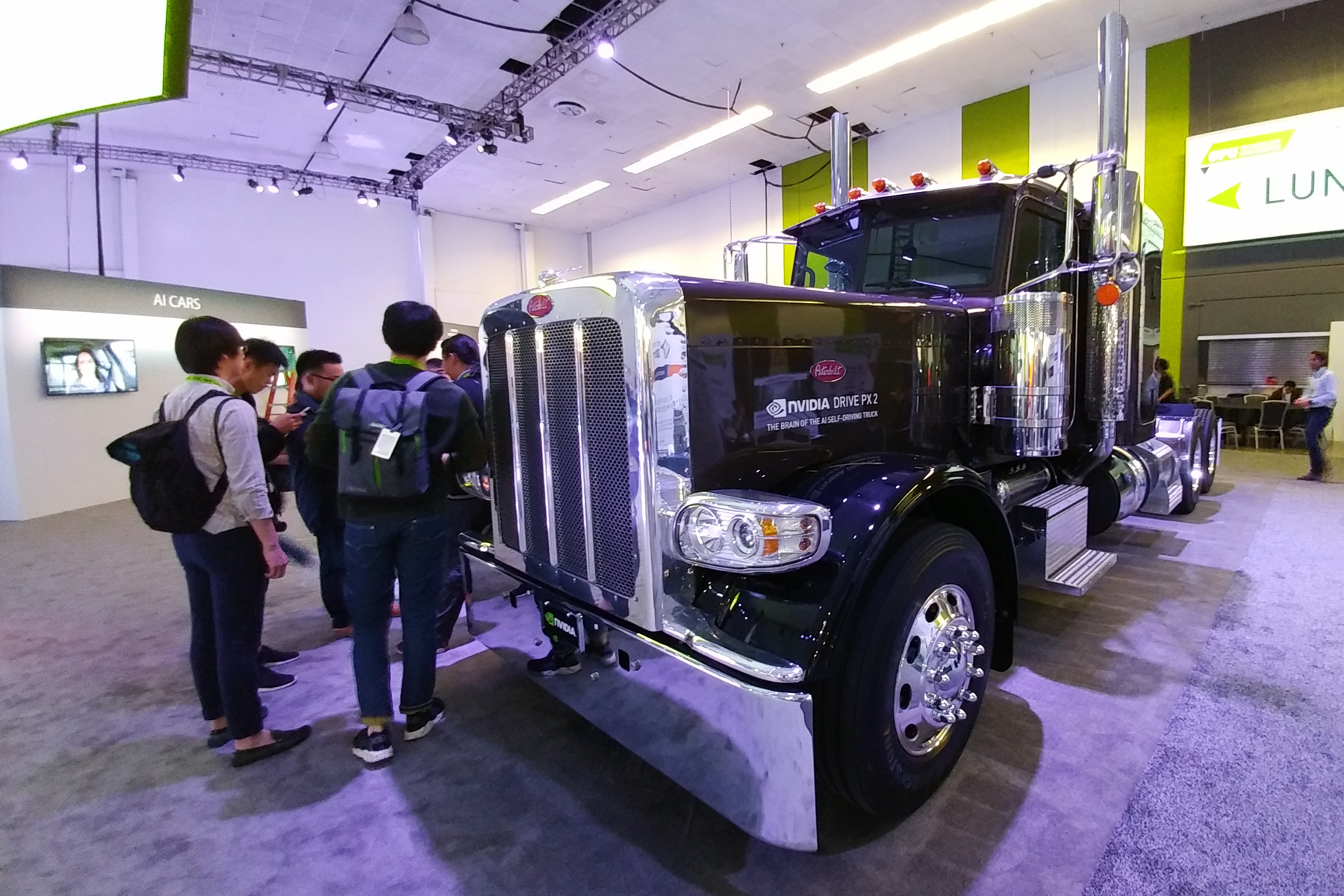 Этот огромный грузовик Peterbilt затащили в выставочный зал для того, чтобы показать рабочий концепт автопилотируемого грузового автомобиля, соответствующего возможностям SAE Level 4, который использует решение Nvidia DRIVE PX 2, основанное на натренированных нейросетях. При наличии около 300 миллионов грузовиков по всему миру, проезжающих более 1,2 триллиона миль в год, применение автопилотов вместо дальнобойщиков может увеличить безопасность и сократить издержки.