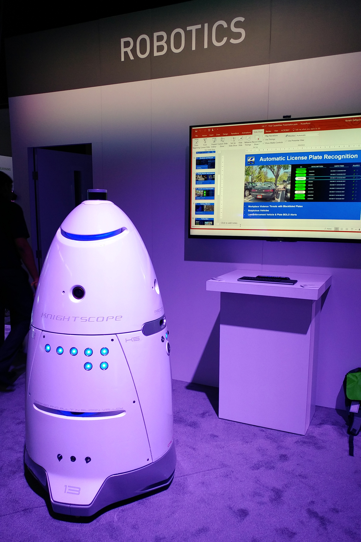 Были на выставке и роботы, помогающие в наведении общественного порядка, хотя и не человекоподобные, как дубайский вариант. Да оно и не всегда нужно, чтобы у робота были руки, ноги и голова. Главное, чтобы он выполнял возложенные на него задачи. Следующий робот умеет распознавать автомобили и номерные знаки, к примеру.