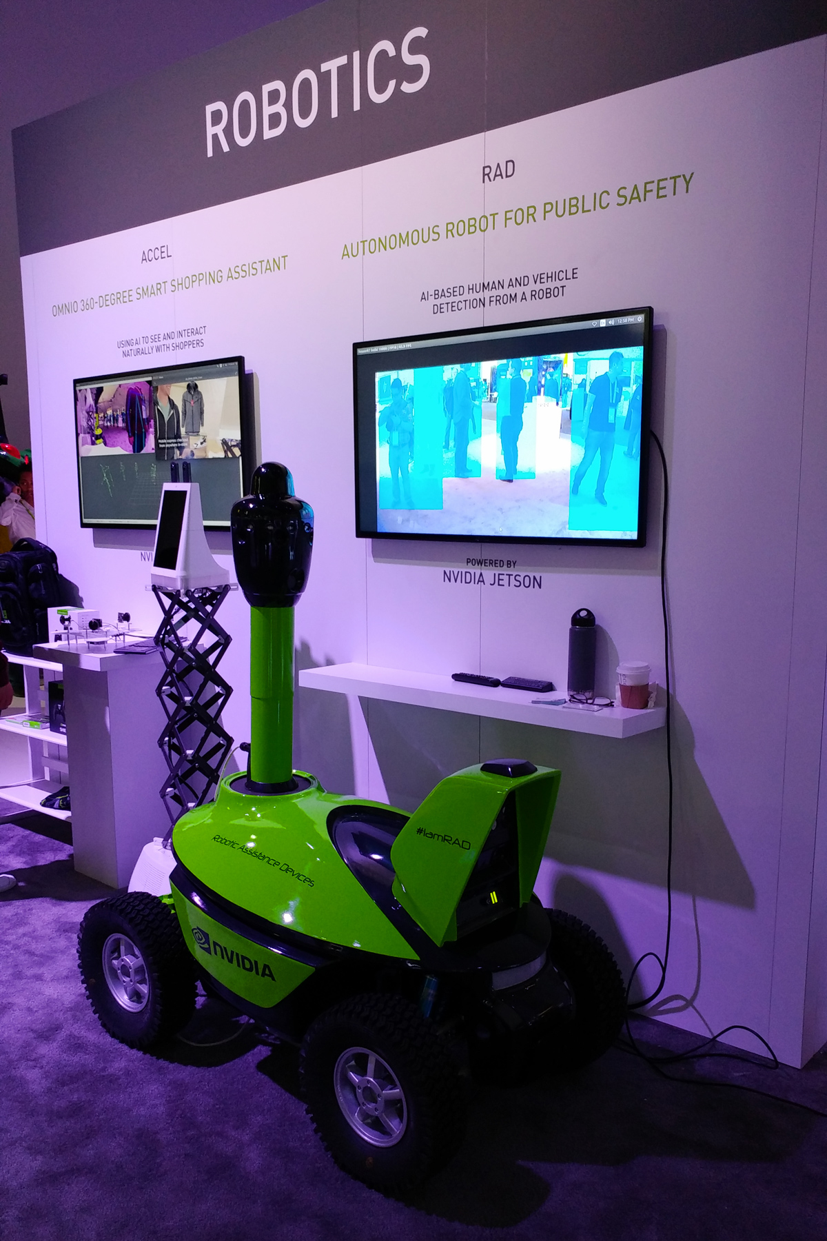 Вообще, роботизация в сфере общественной безопасности на GTC была представлена довольно широко — вероятно, и спрос на такие решения больше, чем на другие. Следующий робот — Robotic Assistance Devices (RAD), основанный на платформе Nvidia Jetson, предназначен уже для более широкого круга задач, хотя и схожих с предыдущим — все они умеют двигаться и отслеживать активность людей и автомобилей.