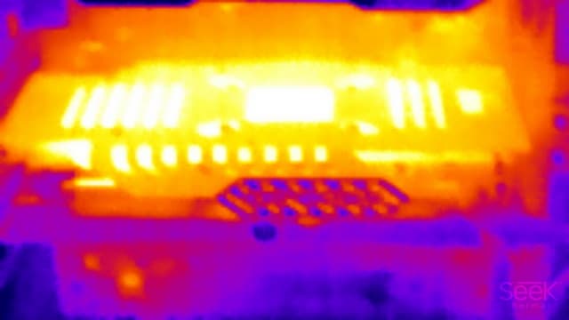 Наибольшая температура — в районе GPU, однако задняя крышка, участвуя в охлаждении и нагреваясь, перераспределяет тепло от ядра, силовых транзисторов и микросхем памяти по всей PCB.