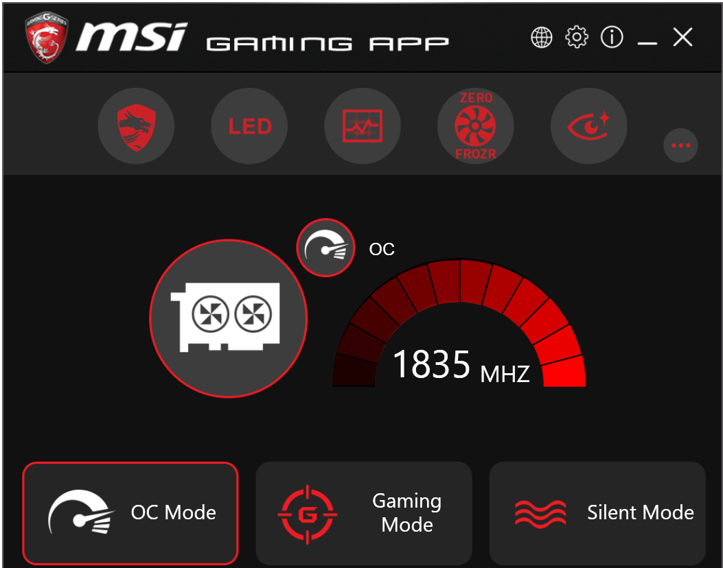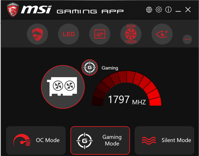 Программа позволяет выбрать режим работы ускорителя в 3D: самый быстрый (OC Mode), обычный (Gaming Mode) и тихий (Silent Mode) — различия между ними заключаются лишь в частотах работы. Надо сказать, что для данной карты «тихий» режим, по сути, не нужен: СО практически бесшумна даже в самом быстром (ОС Mode) режиме. MSI Gaming App позволяет выставить режим подсветки кулера, управлять кулером вручную, а также автоматически определять и активировать режим работы VR (при подключении очков VR к видеокарте).