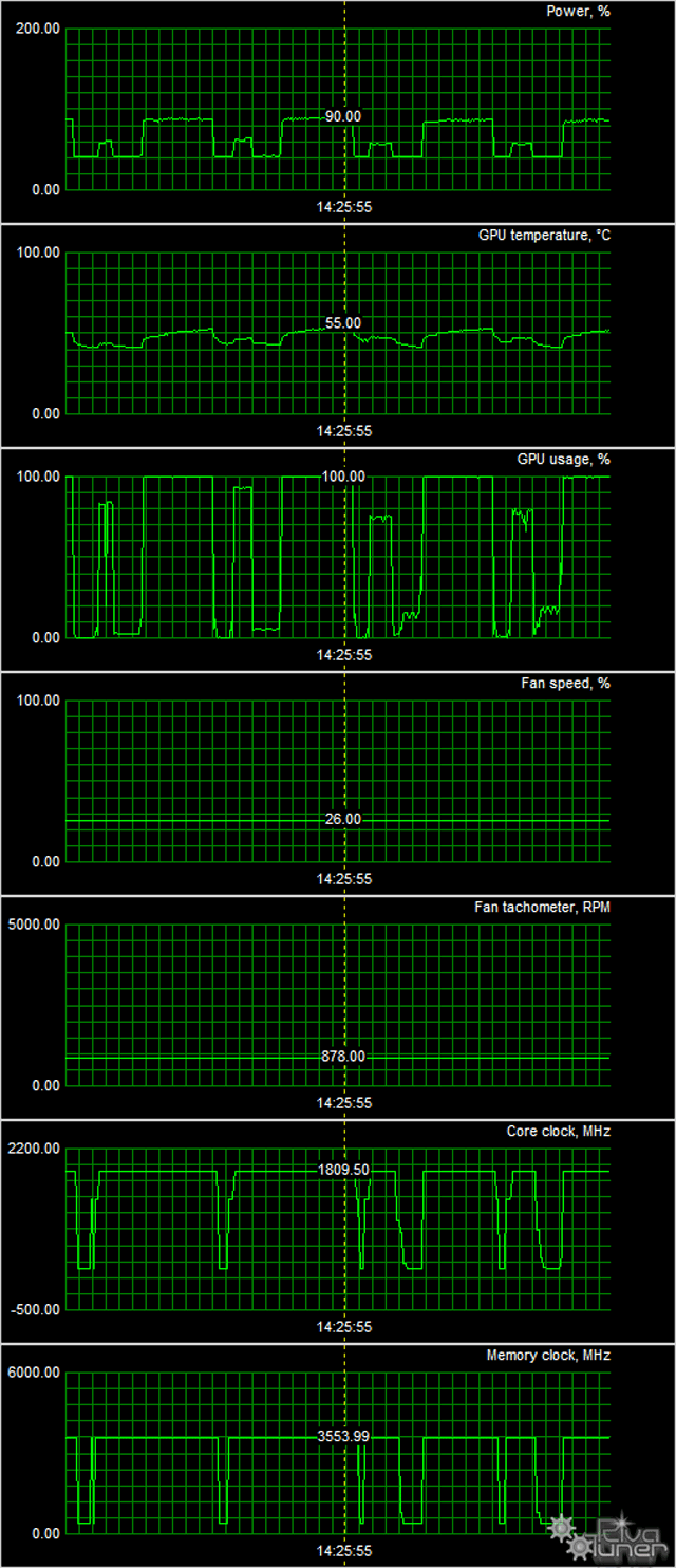 В режиме максимальной нагрузки в 3D температура достигала 55 °C. Вентиляторы при этом раскручивались до 878 оборотов в минуту, шум вырастал лишь до 20,0 дБА, так что данную СО можно считать практически бесшумной.