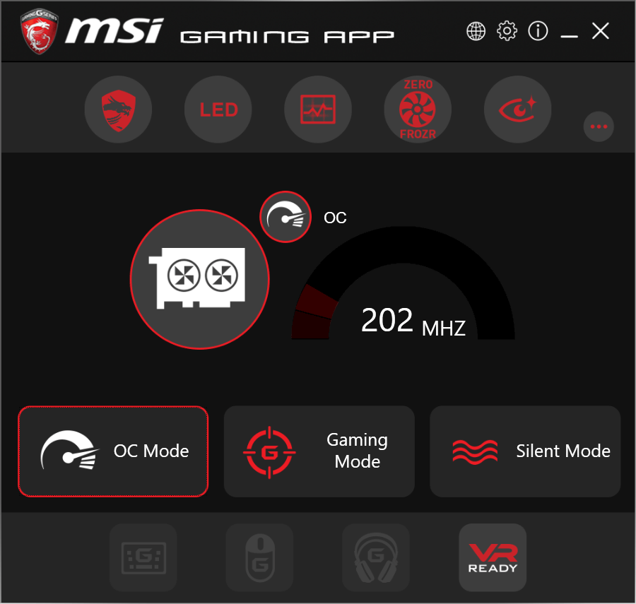 Программа позволяет выбрать режим работы ускорителя в 3D: самый быстрый, обычный и тихий (различия между ними заключаются лишь в частотах работы). Эти режимы, скорее всего, просто достались карте по наследству от предыдущего поколения, потому что, например, «тихий режим» данной карте вообще не нужен: СО тихая даже в самом производительном (ОС) режиме. Утилита также позволяет выставить режим подсветки кулера, управлять кулером вручную, включить режим отдыха для глаз, а также автоматически определять и активировать режим работы VR (при подключении очков VR к видеокарте).