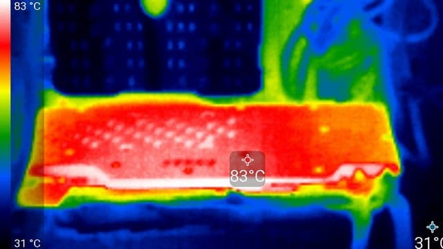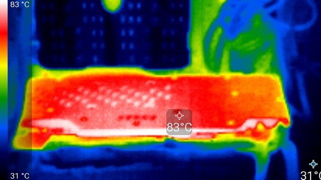 Максимальный нагрев 91 °С — на печатной плате в районе выреза в пластине с обратной стороны.