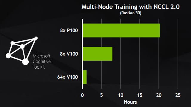 Вот еще несколько примеров сравнения V100 с P100 в некоторых задачах, использующих фреймворки глубокого обучения: Caffe 2, Microsoft Cognitive Toolkit и MXNet, в которых уже применяются вычислительные возможности специализированных тензорных ядер: