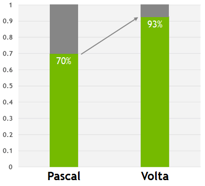 Восемь тензорных ядер в каждом мультипроцессоре SM выполняют в общем 1024 операции с плавающей запятой за такт, что в восемь раз быстрее, чем может обеспечить мультипроцессор архитектуры Pascal с использованием стандартных FP32-операций. В целом, если сравнивать GV100 с вычислительным процессором GP100, это приводит к увеличению производительности в задачах глубокого обучения в 12 раз.