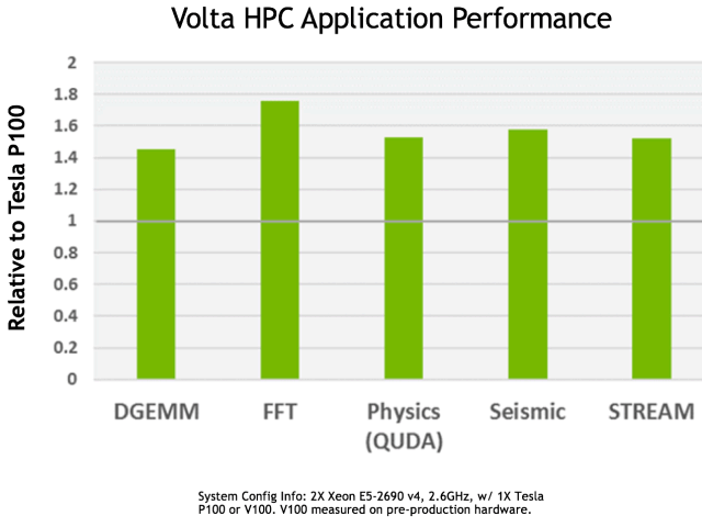 Как видите, новинка на чипе архитектуры Volta на тестовой системе из пары Xeon E5-2690 v4 обеспечила в среднем полуторакратный прирост в скорости в типичных HPC-задачах. Если в DGEMM (перемножение матриц с двойной точностью) V100 опережает P100 более чем в 1,4 раза, то в других применениях, таких как быстрое преобразование Фурье (FFT) прирост достигает 1,75 раза, что весьма неплохо.