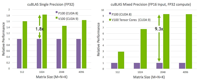 На следующей иллюстрации показано, как применение тензорных ядер вычислительного процессора Tesla V100 повышает производительность операций библиотеки cuBLAS (ускоренная на GPU библиотека основных операций линейной алгебры) более чем в 9 раз — по сравнению с ускорителем Tesla P100, основанным на чипе архитектуры Pascal.