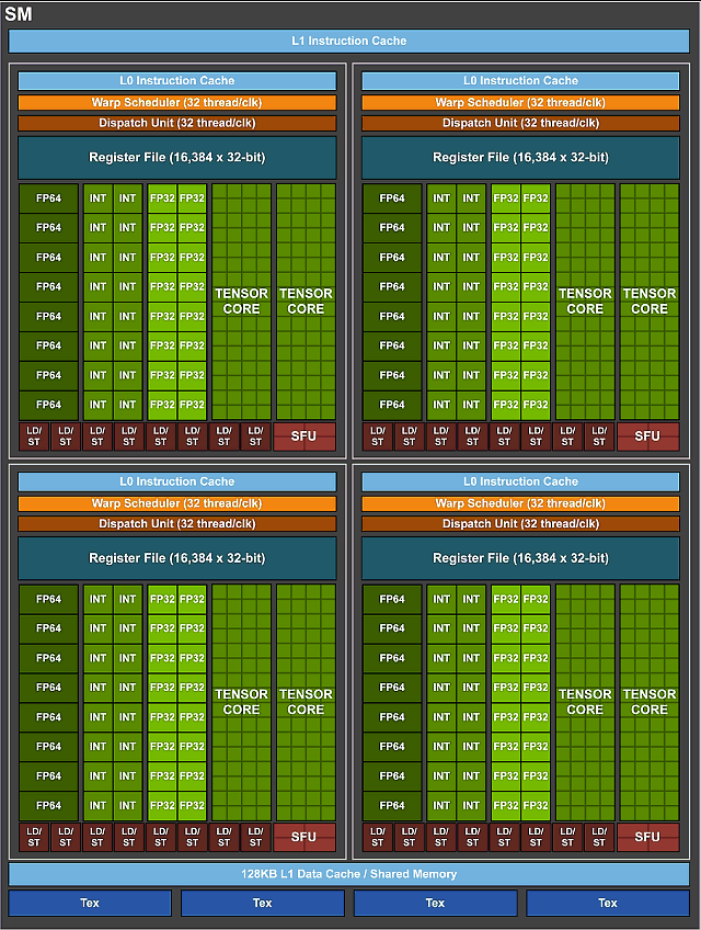 На иллюстрации показан полноценный чип GV100 с 84 мультипроцессорами, а в ускорителе Tesla V100 используется его версия с 80 активными мультипроцессорами SM. Полная версия вычислительного процессора архитектуры Volta содержит шесть кластеров GPC и 42 кластера TPC, каждый из которых содержит по два мультипроцессора SM. То есть, всего в чипе есть 84 мультипроцессора SM, каждый из которых содержит 64 вычислительных ядра FP32, 64 ядра INT32, 32 ядра FP64 и 8 новых тензорных ядер, специализирующихся на ускорении нейросетей. Также каждый мультипроцессор содержит по четыре текстурных модуля TMU.
