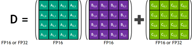 GPU архитектуры Volta поддерживает новые инструкции и форматы данных, удобные для обработки массивов матриц 4×4. Каждое тензорное ядро обрабатывает матричный массив 4×4×4, выполняя операцию D = A × B + C, где A, B, C и D — это матрицы размером 4×4. Вычислительные ядра считывают два значения с FP16-точностью, упакованные в один регистр (матрицы A и B), их перемножение осуществляется с FP32-точностью, результат суммируется с FP32- или FP16-значением и записывается с 32-битной или 16-битной точностью. Для задач глубокого обучения такой точности вполне достаточно, и вполне может быть, что способности тензорных ядер пригодятся также и в других задачах.