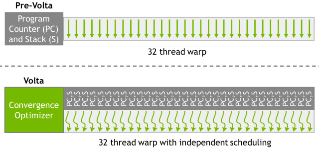 На иллюстрации показана архитектура независимого планирования потоков Volta по сравнению с Pascal и ранними архитектурами. Volta сохраняет ресурсы планирования для каждого потока, такие как счетчик программ (PC) и стек вызовов (S), в то время как ранние архитектуры сохраняли эти ресурсы только для каждого варпа. Независимое управление потоками в Volta позволяет вычислительному процессору выполнять любой поток, чтобы эффективнее использовать вычислительные ресурсы или позволить одному потоку ждать данных от другого.