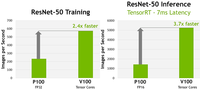 По приложенной выше диаграмме хорошо видно, насколько новый ускоритель Tesla V100 быстрее в задачах глубокого обучения на примере тренировки и инференса нейросети ResNet-50. На левой части иллюстрации показано 2,4-кратное ускорение тренировки этой нейросети на Tesla V100 по сравнению с Tesla P100, а справа — 3,7-кратное ускорение инференса при целевом значении задержки в 7 мс при смене Tesla P100 на V100.