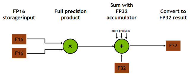 Каждое тензорное ядро осуществляет 64 операции умножения-сложения с однократным округлением (fused multiply-add — FMA) с плавающей запятой смешанной точности за один такт. Точность вычислений в этой операции смешанная, многократное перемножение двух FP16-матриц осуществляется с FP32-точностью, накопление также совершается с FP32-точностью, и результат выдается в FP32-формате.