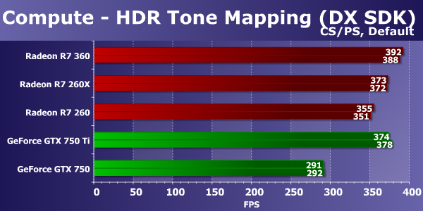 Сравнение Radeon R7 360 с платами GeForce в этом тесте также приносит не совсем ожидаемые выводы. Обновление архитектуры Nvidia с Kepler до Maxwell (пусть и первого поколения в случае графического процессора GM107) привело к тому, что новые чипы калифорнийской компании в таких тестах приблизились к конкурирующим решениям AMD или даже обогнали их. В этом сравнении, модели производства компании Nvidia показали высокую скорость, и хотя прямой конкурент в виде модели GeForce GTX 750 уступил новинке AMD, но это отставание совсем небольшое. Да и по сравнению R7 260X и GTX 750 Ti видно, что времена, когда решения AMD были в разы сильнее в таких тестах, уже прошли.