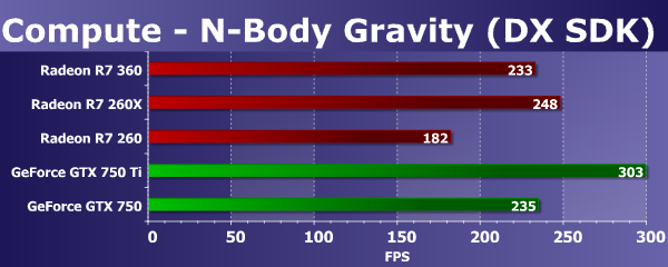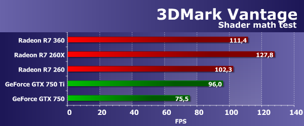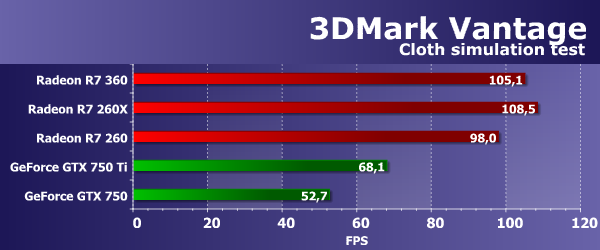 Мы знаем, что видеочипы компании AMD с архитектурой GCN справляются с задачами лучше решений конкурента в тех случаях, когда выполняется интенсивная «математика», касается это и данного подтеста из Vantage. Лишь старшая модель компании Nvidia, основанная на полноценном графическом процессоре GM107, подтянулась к решениям конкурента, а прямой ценовой соперник сегодняшней новинки отстал от всех плат Radeon довольно серьезно. Плата Radeon R7 360 показала скорость явно выше, чем у GeForce GTX 750, да и GTX 750 Ti.