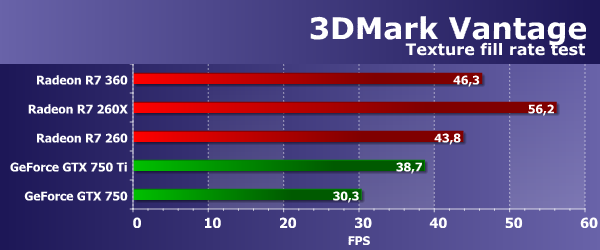 Синтетические тесты из пакета 3DMark Vantage покажут нам то, что мы ранее упустили. Feature тесты из этого тестового пакета обладают поддержкой DirectX 10, до сих пор актуальны и интересны тем, что отличаются от наших. При анализе результатов видеокарты модели Radeon R7 360 в этом пакете мы сделаем какие-то новые и полезные выводы, ускользнувшие от нас в тестах из пакетов семейства RightMark. Feature Test 1: Texture Fill