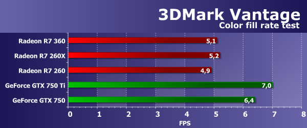 Значения производительности во втором подтесте 3DMark Vantage показывают скорость блоков ROP без учета величины пропускной способности видеопамяти (т. н. «эффективный филлрейт»), и тест измеряет именно производительность этой подсистемы. Рассматриваемая нами сегодня плата Radeon R7 360 оказалась на одном уровне с моделью Radeon R7 260X, основанной на полноценном чипе Bonaire, так как они имеют одинаковое количество и эффективность работы блоков ROP. А вот аналогичная модель R7 260 немного им уступила именно из-за меньшей частоты GPU.
