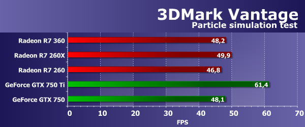Сравнение с платами GeForce в этом тесте для бюджетной Radeon приятное — несмотря на теоретически меньшее количество геометрических исполнительных блоков и отставание по геометрической производительности чипов AMD, по сравнению с конкурирующими решениями, все платы Radeon в этом тесте работают эффективнее и обгоняют все видеокарты GeForce, представленные в сравнении. Так, прямой конкурент GeForce GTX 750 оказался почти вдвое медленнее рассматриваемой сегодня видеокарты AMD. Feature Test 5: GPU Particles