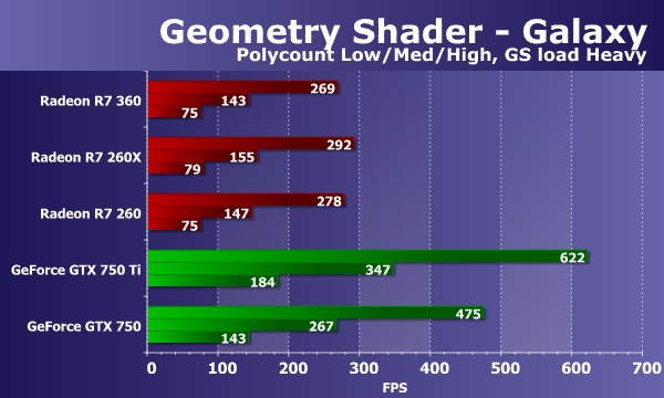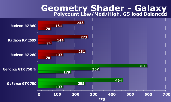 Бюджетная модель Radeon R7 360, основанная на графическом процессоре Tobago, в геометрическом тесте показала себя на уровне Radeon R7 260 и R7 260X, что неудивительно, так как все они основаны фактически на одном и том же GPU (Tobago — Bonaire). А вот сравнение с конкурентом куда менее радостное — все Radeon отстают и от GeForce GTX 750 и от GTX 750 Ti. Посмотрим, как изменится ситуация при переносе части вычислений в геометрический шейдер: