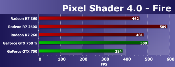 Впрочем, рассмотрим еще один тест шейдерных вычислений, который носит название Fire. Он тяжелее для ALU, и текстурная выборка в нем только одна, а количество инструкций типа sin и cos увеличено вдвое, до 130. Посмотрим, что изменилось при увеличении нагрузки: