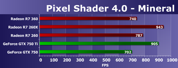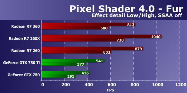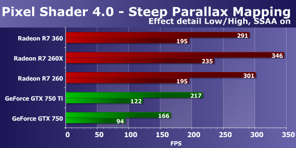 Графические решения AMD Radeon и в этом D3D10-тесте пиксельных шейдеров работают явно эффективнее конкурирующих плат GeForce. В этот раз видеоплата на базе графического процессора Tobago все так же серьезно опережает GeForce GTX 750 и GTX 750 Ti в обоих режимах. Новая модель Radeon в этих условиях примерно равна по скорости видеокарте на основе чипа Bonaire — аналогичной по своим характеристикам. Ну и Radeon R7 260X оказалась лишь чуть быстрее рассматриваемой модели, как и должно быть.
