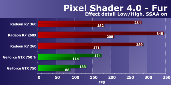 Первым тестом пиксельных шейдеров будет Fur. При самых низких настройках в нем используется от 15 до 30 текстурных выборок из карты высот и две выборки из основной текстуры. Режим Effect detail — «High» увеличивает количество выборок до 40—80, включение «шейдерного» суперсэмплинга — до 60—120 выборок, а режим «High» совместно с SSAA отличается максимальной «тяжестью» — от 160 до 320 выборок из карты высот.