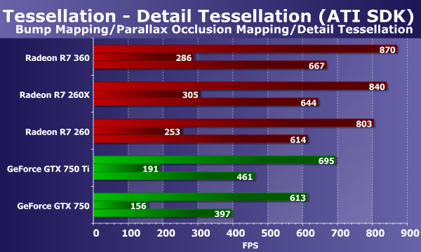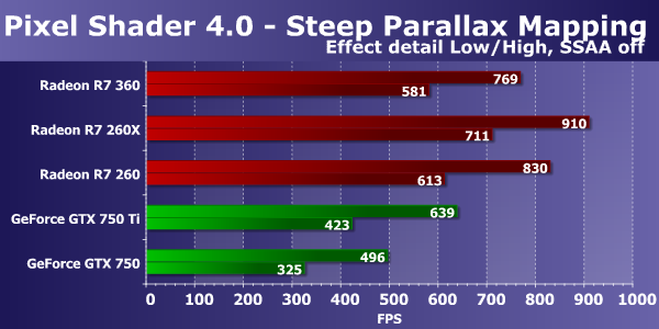 Обычно видеокарты Radeon в этом тесте показывают близкие результаты, так получилось и на этот раз. Новая бюджетная плата компании AMD выступила очень неплохо, на уровне более мощной Radeon R7 260X, за исключением одного подтеста с параллакс-маппингом, где требуется не геометрическая производительность, а математическая. В целом же, новинка опередила и Radeon R7 260 из-за повышенной частоты для GPU и лучшей программной оптимизации, и обе GeForce остались далеко позади.