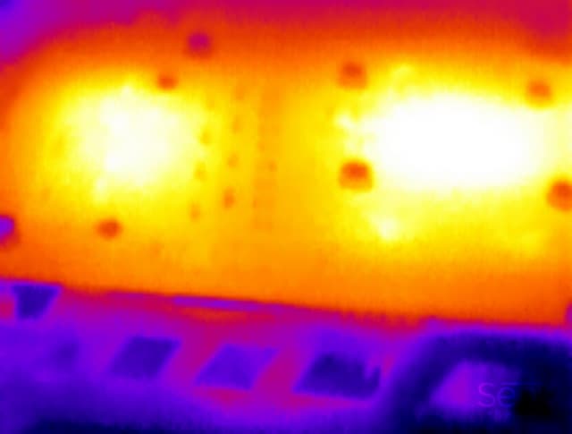 Хорошо видно, что наиболее нагретых областей — две: в районе GPU и преобразователей напряжения.